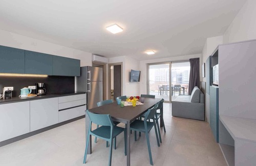 2 bedrooms each with 1 double bed, 1 single bed, TV and access to the balcony. Living/bedroom with 2 additional beds on double sofa bed, sitting area, TV, dining area (8 seats) and access to the balcony. Kitchenette in the living & bedroom with gas stove, dishwasher, fridge (icebox), microwave, coffee machine, electric kettle and access to the balcony. Bathroom with shower, 1 washbasin, WC and hairdryer. Bathroom with washing machine, shower, 1 washbasin, WC and hairdryer. Terms of lease and pricesIncluded in the priceinternet access, air conditioning, parking place, washing machine, electricity, gas, water, local tax (under 12 years), Bed linen (weekly change), Wireless Internet access. Side costs-Additionally(Payable when booking)/additonal fee for short-term stays (less than 6 nights) obligatory 138 € per booking per stay.Costs on the spot:/Obligatory:final cleaning 40 € per object per stay. local tax by local tariff (if charged).On request:high chair 2 € per piece per day. Towels (please order at booking) 12 € per person per first time use and changing. baby cot – please order at booking 4 € per bed under 3 years per day.Deposit:EUR 200,-/object.