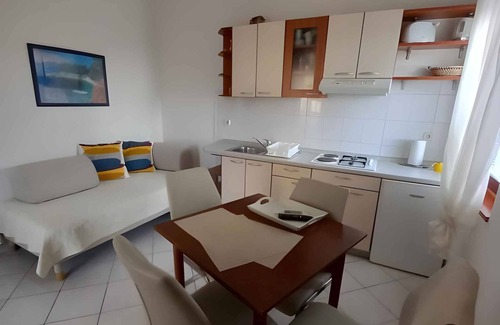 The holiday apartment is furnished in a functional style. Available for shared use: garden shower, barbecue facilities and garden furniture. Cot on demand.LocationUgljan. The holiday apartement is located on a 500 sqm garden plot. The landlord lives permanently in the house, but uses a seperate entrance. Access is via a path (asphalted). Parking is available on the property. Specialair conditioning.Facilities: baby cot and internet access (WLAN). TV reception takes place via satellite. Leisure3 bicycles. Dogsnot allowed. DistancesShopping 50 m, restaurant 20 m, town center 2 km. railway station in Zadar 12 km. Bus stop 50 m. Zadar Airport (Zemunik) 22 km away. In summer: Adriatic Sea 75 m in Mulin (beach 75 m featuring sand, gravel and rocks). boat rental in 70 m. tennis in Ugljan 2 km. DivisionHoliday apartment, 1 floor, 2 rooms (including 1 bedroom), 30 sqm, in total 3 beds (including 1 additional bed), on request additionally 1 child up to 2 years in a baby cot. RoomThe entrance to your holiday apartment is located on the 1st floor