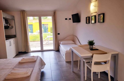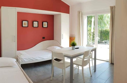 The holiday apartment is located in an apartment house and is modern and functional furnished. The property is located in a holiday complex. For use are available: children's playground, grill possibility and terrace. Guest garden, loungers and parasols by the pool, subject to availability.Holiday resortreception, bar and laundry. Shuttle to the center, paid by the municipality, paid on site. LocationImperia. The holiday apartement is located in a holiday complex, on a garden plot. The village is located in the immediate hinterland of the city of Imperia Porto Maurizio and is easily accessible via both the motorway and Via Aurelia. The place is surrounded by the typical hills of the Ligurian landscape and designed with the characteristics of a modern and well-kept tourist village. There are gardens in the village where you can enjoy the silence and the surrounding nature. The buildings are connected by wide avenues that can be reached on foot or by bike. In front of the property you will find the cycle/pedestrian path, which in a few minutes connects to the Riviera dei Fiori cycle path, which runs for about 30 km along the coast. The access goes via a side road. Parking lot (for 1 car) on the property. There is a charging station for electric cars on the property. 1 outdoor parking space free of charge, underground parking on request 8 euros per day Specialair conditioner, central heating. Facilities: internet access (WLAN). PoolOutdoor pool. Children's pool. Open from May to around October 15th, weather permitting, pool hours from 10 a.m. to 7 p.m. - beach with special conditions, approx. 180 m² LeisureIn the complex: table tennis, table football and bike rental. Bowling, beach volleyball on request, free of charge, football Dogsnot allowed. DistancesShopping opportunity 650 m, restaurant 600 m. DivisionHoliday apartment, 1 floor, 2 rooms (including 1 bed rooms), 39 sqm, in total 5 beds (including 3 additional beds). Room Bedroom with 1 double bed. Living/bedroom with 3 extra beds on couch/sofa, TV and Patio with garden furniture. Kitchenette in the living room / bedroom with fridge (icebox) and microwave. Bathroom with shower, WC, bidet and hairdryer. Credit cardsVisa, MasterCard. Terms of lease and pricesIncluded in the priceparasol at the pool, electricity, water, local tax (under 14 years), sunloungers at the pool, bed linen (first usage), hand towels (first usage). Side costs-Costs on the spot:/Obligatory:final cleaning 90 € per object per stay. local tax by local tariff (if charged).On request:washing machine 10 € per stage of washing programme based on usage. bed linen 15 € per person per change. hand towels 12 € per person per change. For a fee: bicycle.Deposit:EUR 200,-/object.