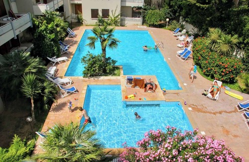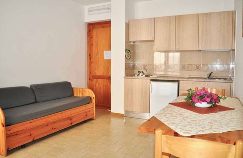 The holiday apartment is furnished in a functional style. The property is located in a busy environment, in a hotel complex, on the outskirts. Also due to the view over a panorama from the property and its sunny location the domicile is popular. Available for use: parasol and sun lounger. Parasols and sun loungers around the poolHoliday resort40 accommodations, lobby and reception. LocationAlghero. The holiday apartement is located in a hotel complex. The complex is spread over 3 floors around the swimming pool. Simple and functional furnishings Bus stop just a few steps away and close to all services such as supermarket, pharmacies, restaurants Specialair conditioning.Facilities: baby cot, high chair and internet access (WLAN). TV reception takes place via satellite.For your safety, the accommodation is equipped with CO2 detector, smoke detector and fire extinguisher. PoolAll pools are available for shared use. Outdoor pool (usable from mid May to mid October, 15.75 m x 9 m, depth 1.45 m). Children's pool (6 m x 4 m, depth 0.50 m). Dogsallowed, EUR 15.00/pet per day. DistancesShopping 100 m, restaurant 150 m, town center 2 km. For a relaxing holiday, a car is recommended. The nearest public transport stop is 100 m away. Alghero: pharmacy, bank each 500 m. airport 8 km. The centre of Alghero can also be reached via a cycle path DivisionHoliday apartment, 1 floor, 3 rooms (including 2 bedrooms), 43 sqm, in total 6 beds (including 2 additional beds), on request additionally 1 child up to 2 years in a baby cot. RoomThe entrance to your holiday apartment leads directly into the living & bedroom. The apartments can be located on the ground floor or on the 1st or 2nd floor. All with outdoor area Bedroom with 1 double bed. Bedroom with 2 single beds. Living/bedroom with 1 additional bed on double sofa bed, TV, dining area (6 seats) and access to the balcony. Cooking nook in the living & bedroom with electric stove (induction stove, 2 plates), fridge and microwave. Bathroom with shower, WC, bidet and hairdryer. Credit cardsVisa, MasterCard. Terms of lease and pricesIncluded in the priceOutdoor pool, air conditioning, electricity, gas, water, final cleaning, local tax (under 12 years), bed linen (first usage), hand towels (first usage), Wireless Internet access. Side costs-Costs on the spot:/Obligatory:final cleaning of the kitchen (if not performed by the tenant) 50 € per object per stay. local tax by local tariff (if charged).On request:parking place 10 € per car per day. safe 10 € per object per week. baby cot – please order at booking 7 € per bed per day.Deposit:No deposit.