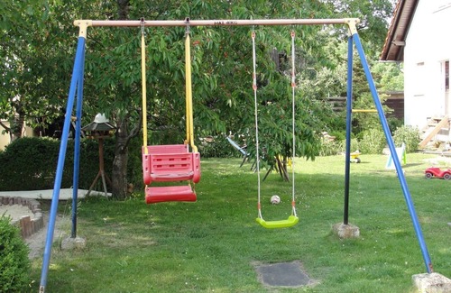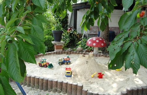 The outdoor area consists of two areas: A terrace area directly at the holiday terraced house with its own table and comfortable chairs, as well as the communal area with a spacious lawn for sunbathing or playing, a large sandpit and a swing.