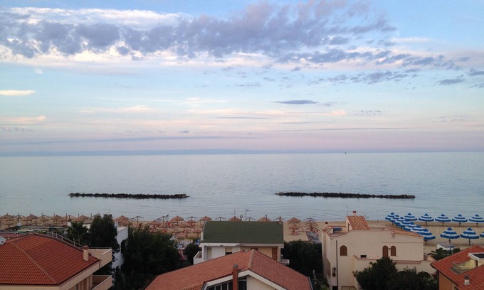 It is located directly on the seafront of Francavilla, blue flag (a title that is attributed to the seaside resorts with the cleanest sea). The beach is of fine golden sand. Served very well by all services: bus stop under the house, supermarket, restaurants, bars, shops, lounge bars, nightclubs nearby, train station 3 Km. Luna Park for children at 100 Mt during the summer. Geographical context ideal for a relaxing holiday by the sea. All the beaches are organized in elegant and well-equipped bathing establishments with restaurants specialized in fish cooking, beach umbrellas, sunbeds, and everything related to the comforts on the beach. Marina with all the amenities at 4 km, possibility to rent pleasure boats. Municipal swimming pool equipped with a fitness room on the parallel street. A few kilometers from the beautiful mountains of the Abruzzo Apennines, reachable in 30 minutes, including the Majella and Gran Sasso with peaks up to almost 3000 meters and enchanting landscapes. Numerous medieval and historical towns throughout the district.