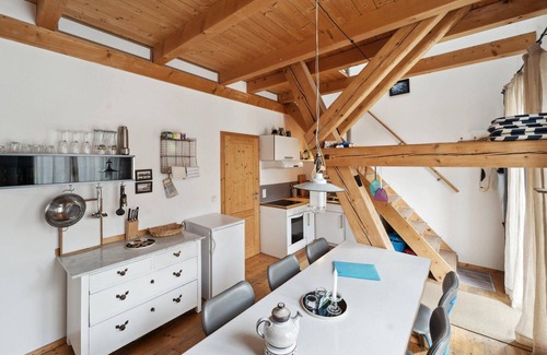 In 2004, the former barn of the farm was transformed into a cosy holiday flat, which was extended in 2018 to include an airy living room with sleeping gallery. The flat is characterised by its organic construction and the use of selected materials. The interior conveys a romantic atmosphere with attention to detail. Light colours, original wooden beams and the inviting incidence of light create a unique ambience. The mezzanine level with workstation, a fully equipped kitchen under another small gallery and a spacious dining area round off the living experience.
