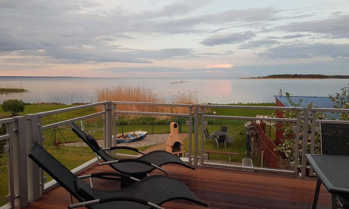 Welcome Everyday life has you firmly in its grip??? You want to enjoy your holiday and really switch off??? Then come to us and spend your holiday in beautiful Altwarp, situated directly on the water!!! Altwarp is a small fishing village situated directly on the white beach of the Szczecin Lagoon, making it the most north-easterly fishing village in Germany. The calm water and the gently sloping shore are a paradise for children. Many cycle tours (with over 500 kilometres of cycle paths) or hiking trails are in the immediate vicinity and offer wonderful tours through forests and across fields. Embedded in the nature reserve with its inland dunes, the Szczecin Lagoon and the juniper, pine and oak forests, Altwarp is the most north-easterly fishing village in Germany. The bathing beach is located in the centre of the village and is ideal for children and non-swimmers due to its slowly deepening water. Explore the beautiful landscape on foot, by bike or take a few trips in your car. The more you experience on your holiday, the more you will have to tell afterwards. The variety on offer makes our accommodation attractive starting points for your possible activities. For your daily needs, there is a small supermarket in Altwarp with fresh bread rolls, an excellent range of meat and sausage products and everything else you need for your holiday. If you prefer to indulge yourself during your holiday, the "Haffstübchen" invites you to enjoy great fish and meat dishes or coffee, cake and ice cream in a maritime ambience from midday onwards. If you are interested in the history of our small village, you can find out more in the Altwarp local history centre. Countless excursion destinations, smaller villages and a wide range of restaurants will accompany you on your explorations. But the main reason for travelling here is the peace and relaxation. Treat yourself to some time out and take a deep breath! Simply take a break from everyday life - take some time for yourself. The nearest larger town is Ueckermünde, approx. 15 km away, with many shopping facilities, a beautiful old town, the harbour, the Haffmuseum and numerous cultural events. There is also a train and bus connection to Altwarp. Boat trips from Ueckermünde harbour to Neuwarp, Szczecin and Swinoujscie are an experience. You can also hire small boats from here and paddle up and down the Uecker. Other attractions in the region include the botanical garden in Christiansberg, the zoo in Ueckermünde and Ukranenland in Torgelow. And for the very active, there is a sports centre in Eggesin with a wide range of opportunities for sporting activities. Day trips to Anklam (e.g. Lilienthal Museum), Stralsund (e.g. Oceanographic Museum), Peenemünde (e.g. Submarine Museum) or the island of Usedom (e.g. sunflower labyrinth, huge bathing beaches) are also recommended. In the garden, which is also fenced, there is a barbecue with a fireplace. From the terrace and also from the balcony you can see the small lagoon. The holiday flat is located on the upper floor, from where the view of the water is overwhelming. The flat has a size of 65 square metres. In the living room there is a sofa bed with a dining table and a flat screen TV. In the living room there is also a fitted kitchen with fridge, dishwasher, cooker, sink, coffee machine, toaster, kettle and crockery for 6 people. The bedroom is at the end of the flat. There is a double bed with two bedside tables. Wardrobes are also available. In the bathroom there is a WC, a shower, a washbasin, a mirror cabinet, a washing machine and the best is yet to come, a whirlpool bath for romantic hours for two. As you can see, you can experience a lot with us and if you just want to enjoy the evening after an eventful day, then do so with the fantastic sunsets directly on the water. A holiday couldn't end in a more romantic and relaxing way. Relax with us and enjoy a carefree time alone or with your family. I wish my guests a pleasant and relaxing stay.Short descriptionOther : Non-smoking houseShort description 1Number of kitchens : 1Other rooms : BalconySurroundingsLeisure facilities : Boat hireSports facilities in the surrounding area : Fishing, canoeing, cycling, rowingSurroundings 1Excursions : Botanical garden, day trips to Szczecin-Swinemünde and Haff round trips, animal park in Ueckermünde, the Ukranenland in Torgelow, Heidebad in Torgelow, the city harbour in Ueckermünde, raft trips on the Uecker where you can feel the peace of the river, meadows and forest, sailing yacht charter trips, safari on the Szczecin Lagoon with expert tour guide but with advance booking.Place description: Whoever visits Altwarp will find it - the good, the happiness, a pearl... Altwarp is an ancient fishing village where everyone can take a deep breath and relax. Just behind the village, the inland dunes invite you to make discoveries that are hardly possible anywhere else. Juniper heaths, sparse pine and oak forests merge with marshy meadow lowlands - a wealth of diversity that only nature can offer. Fishing has been part of this place since 1148 and this has not changed to this day. Altwarp is a border village, water separates the fishing village from its Polish sister Neuwarp.Garden and outdoor facilitiesRecreational facilities at the property : WhirlpoolGarden equipment : Garden furniture available, barbecue
