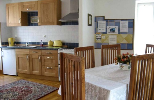 Steps from the living room lead up to a modern, well equipped kitchen with a dining area. The kitchen is the ideal place to make use of your cooking talents with fresh products found in local markets. The kitchen has an electric cooker, fridge/freezer, toaster, and fitted units. The cosy dining area is an attractive focal point for your group to get together over dinner with a glass of wine. A patio door at the rear opens up to steps to the garden where there is a barbecue area.