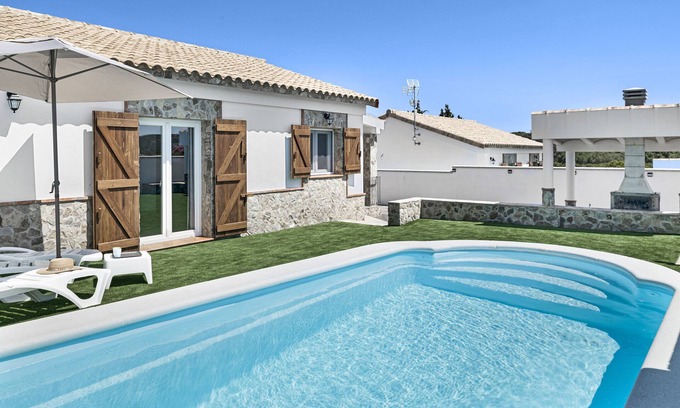 With a view of the Atlantic, the holiday home Casa Faquinse La Muela 2 with step-free access and interior in Vejer de la frontera is perfect for a relaxing holiday. The 60 m² property consists of a living room, a fully-equipped kitchen, 2 bedrooms and 1 bathroom and can therefore accommodate 4 people. Additional amenities include high-speed Wi-Fi (suitable for video calls) with a dedicated workspace for home office, a smart TV with streaming services, air conditioning, a fan, a washing machine as well as a dryer. A baby cot and a high chair are also available. Welcome to our vacation rental with an enticing private outdoor space. Take a refreshing dip in the pool, bask in the lush garden, unwind on the open terrace, find shade on the covered terrace, savor grilled delights on the barbecue, and rinse off in the outdoor shower.