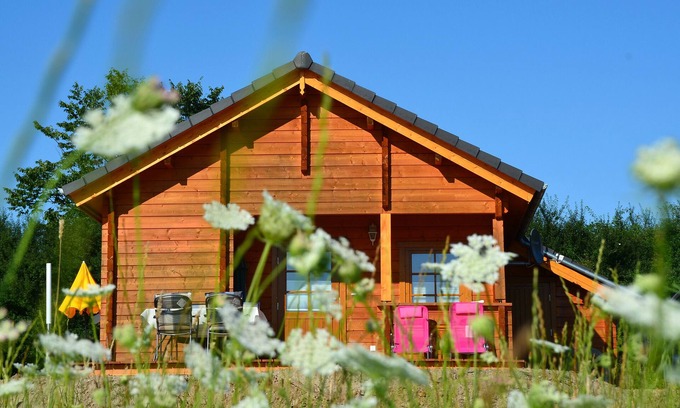 The log holiday home is surrounded by a large plot of land with a shared open terrace.