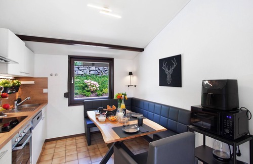The modern living room with smart TV and floor-to-ceiling windows invites you to linger in comfort. Through the living room you enter the open kitchen with a cozy bench for up to 4 people.