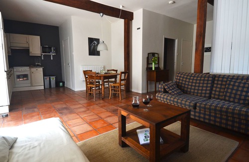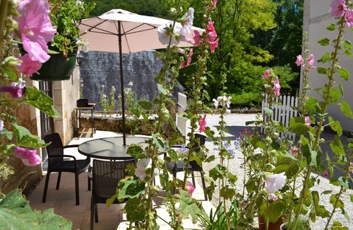 The cozy gite overlooks the sunny courtyard and the green valley in front of the country house. The cottage has its own south-facing sun terrace with barbecue. The 12 by 6 swimming pool is on the other side of the building.