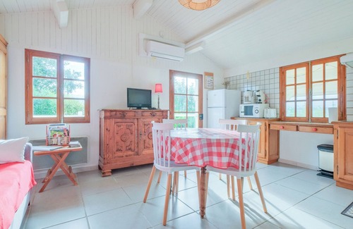 This air-conditioned chalet includes a living/dining room open to the kitchen, one bedroom with a 140x190 bed, a bathroom with walk-in shower, and separate toilets. Bed linen and towels are included.