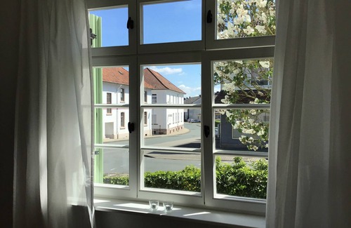The vacation home in front of the Schöneberger Tor is centrally yet quietly located on the edge of the old town of Hofgeismar, which is characterized by half-timbered houses, next to the old town wall. The detached house, built in 1923 in the Heimatschutz style, has a garden with fruit trees at the back. Towards Schöneberger Tor, a front garden extends to the quarry stone wall with pergola on the corner. It is an ideal starting point for excursions in the Sleeping Beauty town and the neighboring Reinhardswald, but also for trips to Kassel, approx. 25 km away, with Wilhelmshöhe Palace and the Grimm Museum. The bright, light-flooded house is geographically located in the middle of Germany. It offers space for several (small) families (e.g. for a family or friends reunion) in a beautiful, hilly landscape with fields, forest and river valleys, which is within walking distance, as are the shopping facilities (small stores in the old town, delicatessens and a large supermarket). We do not cater for groups of friends (e.g. stag parties). Parking is available directly in front of the house. The cellar can be used for bicycles. The house is equipped with WLAN, kitchen and smoke detectors. The oven and dishwasher in the fitted kitchen are a normal size (60cm wide). On Saturday at about 10 a.m. an e-vehicle from a bakery comes to the street selling baked goods (bread, rolls, cakes, eggs) for breakfast. (External service)