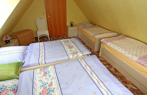 The house on 2 levels is situated on a 4,000 square meter residential plot in quiet location. It is equipped with: Living room (upholstered sitting area, TV, radio / CD), kitchen (dining area, E-cooker, fridge-freezer, microwave, div. Kitchen appliances), bedroom above stairs (double bed, 2 single beds), shower / WC, electric heating. At your disposal are a terrace with seating, barbecue, sun loungers, garaging for bicycles and parking space. The total price includes bed linen, water and energy consumption and final cleaning. Towels must be brought. Pets: In this object, the travel of a small pet is allowed free of charge (maximum 40 cm Risthöhe). The deposit must be paid with the booking. If an entry note is not possible, a late registration must be made.