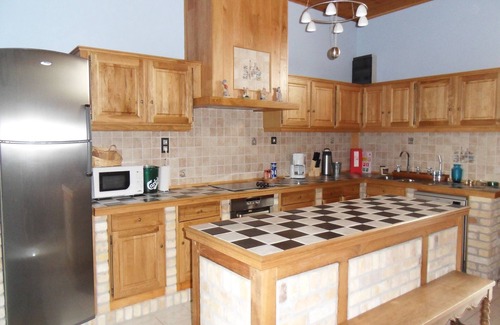 Inside, the well-equipped kitchen features modern appliances including a microwave, toaster, oven, and coffee machine, ideal for preparing group meals. The inviting living area boasts a cozy fireplace and private bar, making it the perfect gathering spot on chilly evenings. Outside, enjoy the spacious garden and terrace with a barbecue area, play equipment for kids, and a boules court for casual fun.