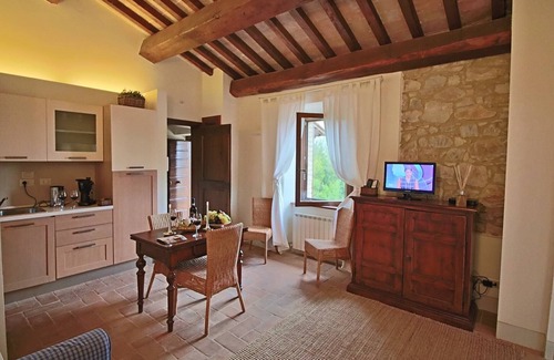 Located in Foligno, this holiday home has 1 bedroom for 3 people. Suitable for a group of friends, guests can relax in the shared swimming pool in summer and access free WiFi here. The farm is located between Foligno, 4 km away, and Montefalco, 9 km away. Foligno is a lively town with historic buildings, quaint shops, and several restaurants to explore. Neighboring towns including Perugia, Spoleto, Bevagna, the medieval city gates and city walls, and the religious town of Assisi (25 km) with its many churches are worth visiting. The open kitchen is well-equipped with a coffee machine, oven, microwave, dishwasher and refrigerator. Guests can lounge on the private terrace and shared garden or cozy around a hot barbecue. This holiday home also features an air conditioning facility. A cot is available at a small fee.