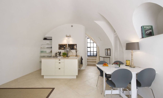 Ever wanted to sleep in an ancient Italian olive mill? Do not imagine a narrow high house and mill winds! The 1817 olive press and the millstone driven by a donkey were in a vaulted space. In the vault is an open kitchen with a dining table. In the same room there is a seat for relaxing. Romantic and comfortable.