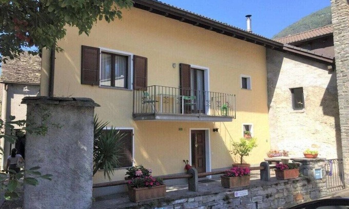 Experience the unique atmosphere following in the footsteps of the world-famous clown Dimitri. This charming holiday home with a special flair is just steps away from the Teatro Dimitri. In addition to excellent cultural activities, the surrounding area offers a variety of activities such as climbing, llama trekking, wild beaches along the river, and more. The region is also a paradise for hikers and nature lovers. • 5-room house on 3 floors • Central location in the village center of Verscio • Restaurants and shops within walking distance . Ground floor (entrance area) • Wardrobe, wall mirror • Bathroom with bathtub, sink, toilet, hairdryer • 1 double bedroom, queen-size bed (160 cm) • Large wardrobe, armchair • 1 bedroom with single bed (140 cm), chest of drawers • Storage room with washing machine and tumble dryer • Private garden seating area with stone table . 1st Floor (Living Area) • Living room with sofa, armchair, coffee table, and fireplace • Fireplace (not available for use) • Exit to balcony with table and 2 chairs • Open, well-equipped modern kitchen with dining table • Ceramic hob, oven, microwave • Refrigerator, freezer • Dishwasher • Kettle, toaster (sandwich toaster) • Nespresso coffee machine (please bring your own capsules) • Bathroom with shower, sink, toilet . 2nd Floor (Attic) • Spiral staircase to the open-plan living/sleeping area • Living room with sofa and TV • 1 double bed, 160 cm • Air conditioning • Public parking approximately 150 m away • Two deck chairs • Pets on request • No smoking, please smoke only outdoors • Heating costs mandatory from the beginning of November to the end of March: CHF 85 per week • Deposit CHF 800 upon credit card payment