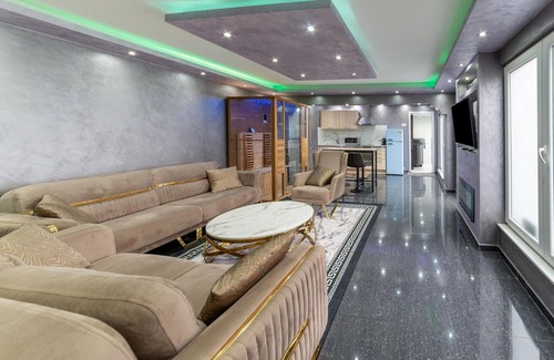 Layout: Ground floor: (hallway, Living room(double sofa bed, fireplace, decorative fireplace), dining room(dining table), Kitchen(electric kettle, cooker, espresso machine, oven, microwave, fridge-freezer), bathroom(shower, washbasin), fitness room(fitness equipment), Bubble bath) On the 1st floor: (bedroom(double bed), bedroom(double bed), bedroom(double bed), bathroom(massage shower, washbasin), Turkish steambath) infrared sauna, air conditioning, terrace, BBQ, BBQ, private indoor pool