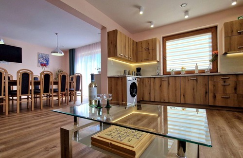 Comfortable, new holiday home with a swimming pool, situated in a picturesque place surrounded by mountains and forests, away from civilization and city noise. The house is located in Wiśniowa - a village 30 km from the city of Rzeszów and 35 km from the Rzeszów-Jasionka airport. The facility has an area of 190 m2 and is suitable for 12 people. Around it there is a recreation area with a barbecue gazebo and a swimming pool. Right next to it there are two small ponds where you can go fishing a bit. There are many suggestions for interesting hiking tours. There are six 2-person rooms, each with two single beds with the option of joining into a double. Additionally, each has a separate bathroom with a shower. The rooms are equipped with a wardrobe, a desk with chairs and a TV set with a satellite antenna. The property has two floors. On the first floor there are four bedrooms and an open relaxation "reading corner", i.e. a place with a sofa, table, lamp and bookcase with reading items. On the ground floor there is a spacious vestibule, two bedrooms, a small separate toilet, a small room economic and a living room with a kitchen. One of the rooms with a bathroom is fully adapted for the disabled. The bathroom has all the necessary handles for the disabled. The ground floor is also adapted for a disabled person in a wheelchair - it is easy to get to the house, room, living room and kitchen. The two downstairs rooms have separate patio doors that lead directly to the outside. The kitchen with an open living room is a common place for all guests. The living room has two chests of drawers, a large table for 12 people and a TV set. The fully equipped kitchen includes all necessary household appliances, i.e. an induction cooker, a microwave oven, an oven, a fridge with a freezer, a dishwasher, a washing machine, a toaster, an overflow coffee machine and a kettle. Additionally, the kitchen has two sofas, an armchair and a table with a few board games. In the salon mi