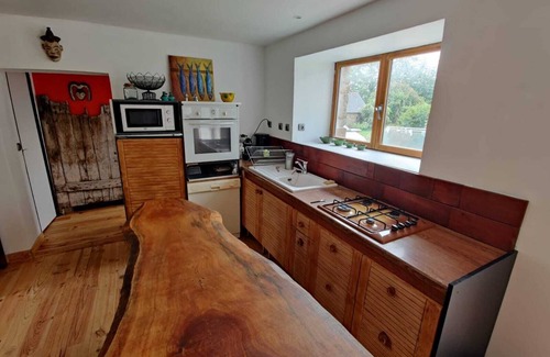 Located in Kervignac, the holiday home Ker Glaz - Longère de charme has everything you need for a comfortable holiday. The 110 m² property consists of a living room, a well-equipped kitchen, 2 bedrooms and 1 bathroom as well as an additional toilet and can therefore accommodate 5 people. Additional amenities include Wi-Fi as well as children's books and toys. A baby cot is also available. This accommodation does not offer: air conditioning and towels. This vacation rental offers a private outdoor area with a garden, open terrace, and barbecue amenities.