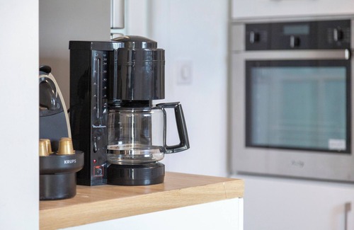 - Fully equipped kitchen: refrigerator, small freezer, oven, microwave, food processor, filter coffee maker, pod coffee machine, kettle, toaster, induction hob, dishwasher, dishes, and cutlery