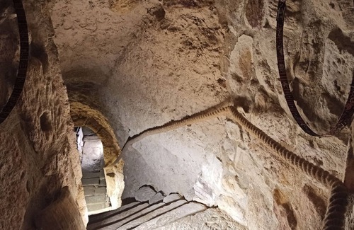 In La Casa del Ayer, time stands still... One of those village houses, at least 400 years old, completely renovated. It has been a very special project for me to preserve its stone walls, its beams, its essence. The house is located in the historic center of Ábalos, a very special medieval village. It has a coat of arms with two keys on its stone façade. And under the house hides its biggest secret, a subway cave about 8 meters deep in stone... When you start going down the stairs you are amazed.... The sensation cannot be explained with words, the best thing to do is to feel it.
