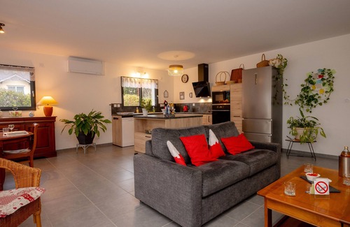 Single-storey detached house on 700 m2 of enclosed land with gravel courtyard. Entrance hall, living room/kitchen opening onto a tiled terrace and garden, 3 bedrooms (2 single beds 90x200 cm / 1 double bed 160x200 cm) including 1 bedroom with en-suite shower room (1 double bed 160x200 cm + en-suite shower room and wc), bathroom (bath), separate wc, workshop/laundry room (washing machine, bicycle repair workshop). Electric car charging station in courtyard. Outdoor pool at La Rochette (600 m) and water games at Détrier (1.7 km) in summer. Indoor pool in Pontcharra (9.7 km).