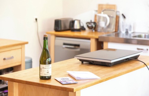 - Equipped kitchen: fridge/freezer, electric oven, filter coffee maker, pod machine, kettle, toaster, 2-burner induction hob, dishwasher, dishes and cutlery