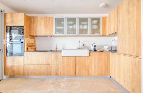 Enjoy a spacious, light-filled living area with a large kitchen that opens onto the living and dining rooms. The villa is air-conditioned for your comfort on hot days.