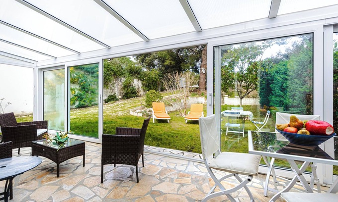 This vacation rental features a private outdoor space with a garden, open and covered terraces, and a barbecue.