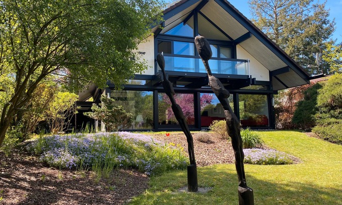 In Grünheide (Mark), you will find this bright, modern holiday home with 160 m² of living space for up to 6 guests. It offers three spacious bedrooms with 180x200 cm beds, high-quality mattresses, and allergy-friendly bedding with encasings. Two bathrooms and a fully equipped private kitchen are at your disposal. The furnishings combine stylish modern and antique solid wood furniture in an allergy-friendly environment. In the large living room, you will find an open fireplace, a large dining table, and a media corner with smart TV. Amenities include Wi-Fi (suitable for video conferences), washing machine, dryer, private barbecue, and convenient self-check-in.