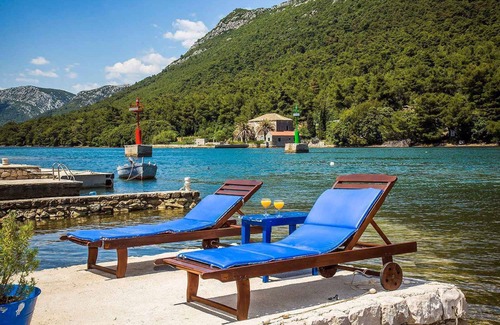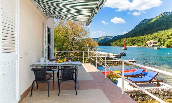 The detached holiday home is furnished in a functional style. The property is located on the outskirts. Also due to the view over the sea from the property and its quiet and sunny location at the water the domicile is popular. Available for your exclusive use: parasol, sun lounger, garden shower, barbecue facilities, terrace and garden furniture. 1 kayak and SUP board are available for use free of chargeLocationSton, district Broce. The holiday home is located on a 200 sqm enclosed garden plot with flowers and trees, bordered by a fence. The landlord does not live in the house or on the property. Access is directly from the main road (asphalted). Parking is available on the property. Specialair conditioning, electric heating.Facilities: baby cot, internet access (WLAN), iron and washing machine. TV reception takes place via satellite. Leisure2 bicycles. Dogsallowed, EUR 50.00/pet per stay. DistancesShopping 1500 m, restaurant 1500 m, town center 1500 m. airport in Dubrovnik 70 km. doctor, pharmacy, bank each 2 km in Ston. In summer: Adriatic Sea 1 m in Broce (beach 100 m in Broce featuring sand and gravel). DivisionHoliday home, 1 floor, 3 rooms (including 2 bedrooms), 100 sqm, in total 6 beds (including 2 additional beds), on request additionally 1 child up to 2 years in a baby cot. RoomThe entrance to your holiday home is located on the ground floor, is at ground level and leads over 4 steps and an external staircase directly into the hallway with doors to all rooms. Bedroom (12 sqm) with 1 double bed and access to the terrace. Bedroom (16 sqm) with 1 double bed, 1 additional bed on couch/sofa and access to the terrace. Living/bedroom (18 sqm) with 1 additional bed on couch/sofa, TV, radio and access to the terrace (40 sqm, garden furniture, 1 table, 6 chairs, 3 sunbeds, parasol). Kitchen with dining area (6 seats), gas stove (4 flames), oven, extractor hood, dishwasher, fridge (icebox), microwave, coffee machine, toaster, electric kettle and washing machine. Bathroom (8 sqm) with bathtub with shower facility, washing machine, 1 washbasin, WC, bidet, hairdryer and window. Terms of lease and pricesIncluded in the priceinternet access, bicycle, air conditioning, parking place, washing machine, electricity, water, final cleaning, hand towels, Welcome drink, boat, sunloungers, Bed linen (weekly change), Wireless Internet access. Side costs-Additionally(Payable when booking)/local tax.Deposit:EUR 100,-/object