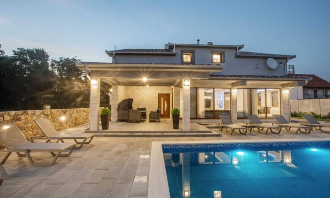 This beautiful, newly built luxury house situated in a quiet village of Gornji Podi, not far from the town of Imotski in inland Dalmatia, is the perfect choice for spending your holidays with family or friends. The perfect blend of modern design and beautiful nature will surely leave you breathless! It comprises of an equipped kitchen and inviting living room with dining and seating area, 5 bedrooms and 5 bathrooms and can accomodate 12 people. When designing the house, every detail was taken care of, both in the interior and the exterior. It offers many extras like a large swimming pool and a smaller children's pool next to it, a hot tub, gym, football and basketball courts and barbecue so that you can enjoy cooking and dining together.