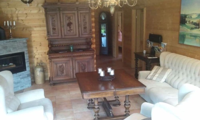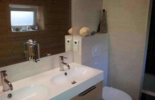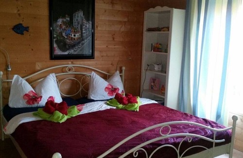 Awarded 5 stars by the German Tourism Association! Ground floor apartment in a Swiss wooden house villa, ecological, barrier-free and healthy wooden construction, All floors heated and terracotta tiled. There is a huge open plan living room with an open farm kitchen & new electrical appliances, Seating and awning on the pond terrace with a wonderful garden or water view of a beautiful biotope. 2 romantic bathrooms: one with a shower bathtub & 2 separate sinks & giant mirror, the second with a mosaic snail shower, The HWR with washing machine and tumble dryer. There are usually large floor-to-ceiling windows, a large panoramic wood-burning stove, WiFi, HD satellite TV. and 2 large sun terraces.