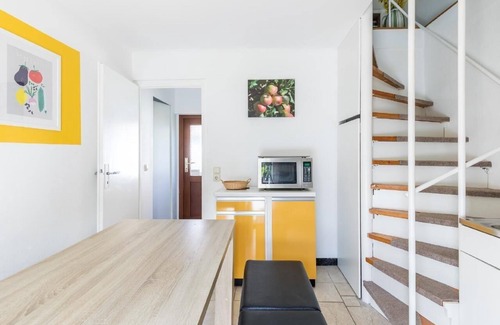 The flat has a separate kitchen. The following appliances are available: Cooker with oven, fridge with freezer compartment, kettle, coffee machine, crockery etc. The bedroom (for 4 people) can be reached via a narrow spiral staircase. It is possible to set up the existing travel cot in the bedroom (upper floor). The bathroom has a shower and WC. There is a television in the living room. Here also 2 persons can sleep on the sofa bed (1,60x2,00m). There is a private car park.