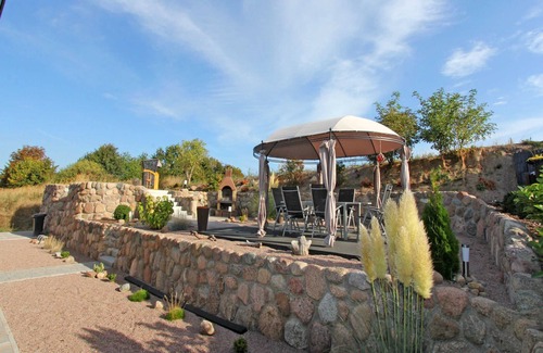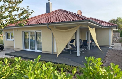 In the district Mahlzow, within sight of the Peene and the same bridge to Wolgast located in a quiet residential area on a 600 sqm plot of 2015 newly built in bungalow style, separate cottage for up to 4 adults and 1 baby. Shops can be found in the city center of Wolgast (about 15 min. Footpath), in the area of the Peene there is a sailing school and the fine sandy beaches of Trassenheide or Zinnowitz can be reached with the Usedomer Bäderbahn (bus stop 5 minutes away) in about 10 minutes.