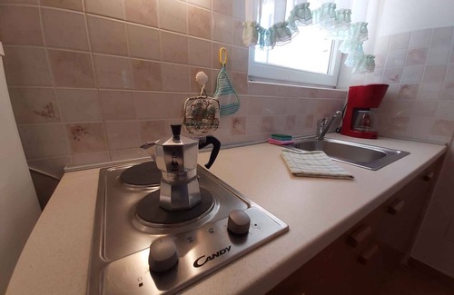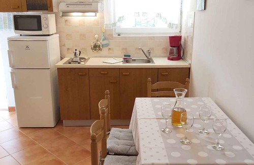 The detached holiday home built in 2004, was renovated in 2019 and is furnished in a typical country style. The property is located in the town centre. Also due to its quiet and sunny location the domicile is popular. Available for your exclusive use: sunbathing lawn, sun lounger, terrace, garden furniture and courtyard.LocationPeroj, district Peros 115b. The holiday home is located on a 100 sqm enclosed garden plot with meadow, flowers and shrubs, bordered by a fence and a hedce. The landlord lives in a separate building on the property. Access is via a side road (asphalted). Parking (for 1 car) is available in a garage and on the property. Specialair conditioning.Facilities: internet access (WLAN) and washing machine. TV reception takes place via satellite. Leisure2 bicycles. Dogsnot allowed. DistancesShopping 150 m, restaurant 200 m, town center 100 m. doctor, pharmacy, bank each 3 km in Fazana. Pula: discotheque, cinema each 12,5 km. indoor swimming pool 13 km and airport 17 km. railway station in Vodnjan 4 km. Main road 200 m. Children's playground 500 m. In summer: Adriatic Sea 800 m in Peroj (beach 800 m in Peroj featuring gravel, stones and rocks). fishing, diving, water sports, boat rental, boat launch each 800 m in Peroj. dog beach in Portic Peros 800 m. DivisionHoliday home, 1 floor, 2 rooms (including 1 bedroom), 40 sqm, in total 4 beds (including 2 additional beds). RoomThe entrance to your holiday home is located on the ground floor and leads over 4 steps and an external staircase and the terrace directly into the kitchen-diner. Bedroom with 1 double bed. Living/bedroom with 2 additional beds on double sofa bed, sitting area, TV, dining area and access to the terrace. Cooking nook in the living & bedroom with TV, dining area, gas stove (2 flames), extractor hood, fridge (icebox), microwave, coffee machine, electric kettle and access to the terrace. Bathroom with washing machine, shower, 1 washbasin, WC, hairdryer and window. Terms of lease and pricesIncluded in the priceinternet access, air conditioning, parking place, electricity, gas, water, final cleaning, sunloungers, Bed linen (weekly change), Wireless Internet access. Side costs-Additionally(Payable when booking)/local tax.Costs on the spot:/On request:bicycle 15 € per bicycle per day.Deposit:EUR 100,-/object
