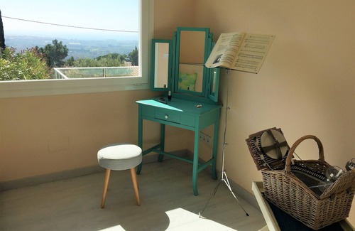 Both bedrooms ( one with double bed, the other with a sofa couch) and the bathroom, all have a view of the Mediterranean garden.