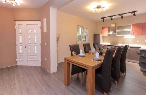 The detached holiday home is furnished in a modern style. The property is located on the outskirts. Also due to the view over the sea from the property and its quiet and sunny location the domicile is popular. Available for your exclusive use: parasol, sun lounger, children's playground, swing, barbecue facilities, terrace and garden furniture.LocationPridraga. The holiday home is located on a enclosed garden plot with meadow, flowers, shrubs and trees. The landlord does not live in the house or on the property. Access is via a side road (asphalted). Parking is available on the property. Specialair conditioning.Facilities: baby cot, internet access (WLAN), iron and washing machine. TV reception takes place via satellite. Dogsnot allowed. DistancesShopping 800 m, restaurant 50 m, town center 800 m. Children's playground 700 m, Zadar 35 km away. In summer: Adriatic Sea 200 m in Pridraga (beach 200 m in Pridraga featuring gravel and bathing plateaus). horse riding in Benkovac 20 km. DivisionHoliday home, 2 floors, 5 rooms (including 4 bedrooms), 220 sqm, in total 10 beds (including 2 additional beds). RoomThe entrance to your holiday home is located on the ground floor, is at ground level and leads directly into the hallway.Ground floor: Bedroom with 1 double bed, 1 baby cot and access to the balcony. Living/bedroom with sitting area, TV and access to the terrace (12 sqm, covered, garden furniture). Cooking nook in the living & bedroom with dining area, electric stove (4 plates), oven, extractor hood, dishwasher, fridge (icebox), microwave, coffee machine, toaster and electric kettle. Bathroom with shower, 1 washbasin and WC. Separate toilet with washing machine, 1 washbasin, WC, hairdryer and window. 1st floor: 2 bedrooms each with 2 single beds and access to the balcony. Bedroom with 1 double bed and access to the balcony. 2 bathrooms each with shower, 1 washbasin, WC, hairdryer and window. Bathroom with shower, 1 washbasin, WC, bidet, hairdryer and window. Terms of lease and pricesIncluded in the pricebabycot, internet access, air conditioning, parking place, washing machine, electricity, gas, water, final cleaning, bed linen, hand towels, baby cot – please order at booking, Wireless Internet access. Side costs-Additionally(Payable when booking)/local tax.Deposit:EUR 200,-/object.