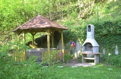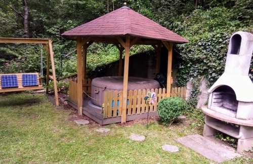 The CHALET (log cabin) is suitable for romantics, lovers, wedding couples, small families as well as young-at-heart retired couples. The outdoor whirlpool offers a special experience with a water temperature of up to 38 degrees. The whirlpool offers unbelievable pure relaxation, far away from everyday life and stress. Haus Wilhelmstal was honoured in the years 2015 to 2021. Green valleys and streams, old trees offer many opportunities for nature-loving holidaymakers to spend an unforgettable holiday in the nature-rich Weserbergland.garden furniture, STRANDKORB, where you can end the day in the evening sun. There is also a car park, natural grounds, stairs, lockable BIKE HOUSE (for a fee). The terrace is equipped with garden furniture and parasol / private terrace, garden loungers, bench, whirlpool (bookable May - Sept.), beach chair, garden grill (charcoal), wooden Hollywood swing and pavilion. Garden and outdoor facilities Leisure facilities at the property: whirlpool (for a fee) Garden equipment: garden shed, garden furniture, beach chair, barbecue (charcoal), gazebo, swing, garden loungers. The holiday home is detached and fenced with a fence or hedge.