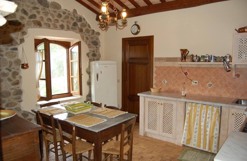 The 19th century country house is built entirely of stone. It was carefully restored by the owners in 2003, preserving the original structure and reusing as many original materials as possible. The load-bearing walls, built with river stones and perfectly preserved, deserve special mention. Even inside, during the restoration, the old charm was maintained: the four-metre high ceilings are made of wooden beams and clay bricks, and the floors are made of handmade clay tiles (some of which are original), giving the impression that time has stood still. On the ground floor of the country house there is a spacious kitchen-dining room with a fireplace, a large dining table, sofas and a well-equipped brick kitchenette. In addition, on the ground floor there is a bedroom with a double bed (160x190cm) and a bathroom with shower en suite, a bedroom with two single beds (each 80x190cm) and a bathroom with whirlpool tub. An external staircase leads to the first floor, where there is a large living room with sofas and a dining table. From here there is access to a well-equipped kitchen with wood-burning stove and a utility room with laundry area. There are two bedrooms, each with a double bed (160x190cm), one of which has a private bathroom with shower, and a bedroom with two single beds (80x190cm each). Another bathroom has a bathtub. All the windows in the villa are fitted with mosquito nets. The living room and kitchen offer a view of the pool, while the bedrooms offer a view of the surrounding hills. The rooms are tastefully and elegantly furnished in the old Arte Povera style. The bedrooms have a precious charm and are all equipped with wrought iron beds. The house offers every comfort: TV in the living room and bedrooms, washing machine, coffee machine, DVD and CD player, stereo system. The fireplaces and wood-burning stove cannot be used.