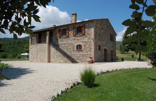 The old farmhouse stands in an unspoilt landscape and enjoys a magnificent view at 450 metres above sea level, immersed in the silence of the Umbrian hills, among vineyards and olive groves.