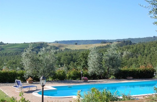 The kitchen-living room on the ground floor offers access to the porch equipped with table and chairs. The property covers about 10,000 m²: one part is a large garden with lawn, while the larger part is covered with olive trees, oaks, cypresses and native bushes. The swimming pool, equipped with sun loungers, parasols and a shower, offers a splendid view of the hilly landscape. In front of the country house is an old handmade fountain. Furthermore, guests have at their disposal an old stone wood-burning oven with barbecue right in front of the house, where they can bake pizza or bread and spend convivial barbecue evenings. The property has a private parking area for guests.