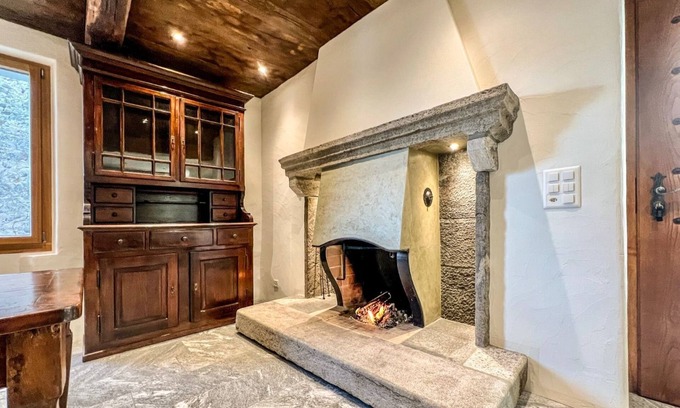 Tastefully furnished with antique furniture from Ticino. On the ground floor there is a large typical Ticino fireplace with a large dining table and kitchen. The floor is made of Valle Maggia granite while in the cosy living room the floor is made of oak, the same material was used in the rooms.