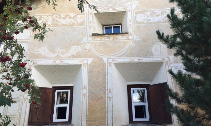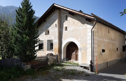 Chesa Delfins is one of these farmhouses. With its well-preserved Renaissance sgraffito, dated 1594, it stands in a row of Engadine houses in the small village of Cinuos-chel. The sgraffito, mentioned in many art guides, depicts dolphins, among other things. Hence the name Chesa Delfins.