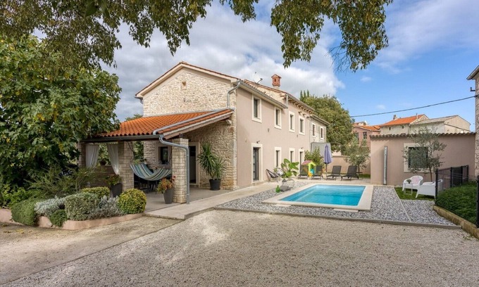 Located in the peaceful village of Pinezići near Marčana in Istria, this modern holiday home provides an ideal space for relaxation and escape to nature. The house offers three spacious bedrooms, each with its own bathroom, and an open living room connected to a fully equipped kitchen. From the living room there is access to a beautifully landscaped garden with a private pool, perfect for enjoying sunny days. Private parking inside the yard, terrace, barbecue and free Wi-Fi are at guests' disposal. The nearest shops and restaurants are located in nearby Vodnjan, and the sea is only 15 kilometers away. The house is equipped with everything necessary for a carefree and pleasant holiday in the countryside. Pets are allowed, with prior notice and inquiry.