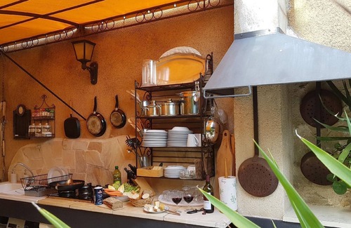 Garden and outdoor facilitiesRecreational facilities at the property : outdoor pool for communal useGarden equipment : garden furniture available, barbecue, bird's nest swingIn the village: tennis court, just behind the inner courtyard is access to the Mediterranean communal garden. Our large pool with a diameter of 5.50 m and the garden shower offer cooling on hot days and the lawns invite you to sunbathe or relax in the shade of the fig trees and review your holiday experiences.many secluded seating areas, including by the idyllic stream, invite you to linger and let the uniqueness of southern nature take effect on you.there is also a bird's nest swing in the garden. We are happy to provide a paddling pool for small children.