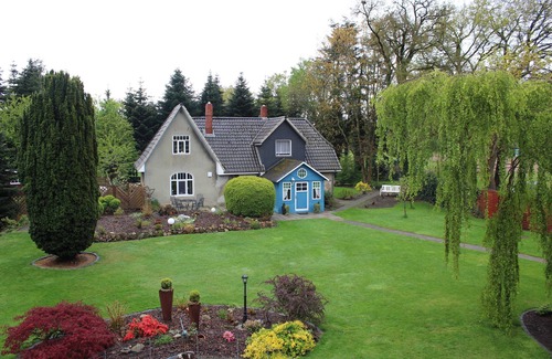 Cottage in country house style with terrace in a quiet rural location in the large garden of a former farm in a secluded location surrounded by large trees and paddocks. Large forest area in about 1 KM. Apartment on the ground floor. Living area approx. 90 sqm, large living room, 1 bedroom with double bed, 1 bedroom with single bed, kitchen, bath with shower. Central heating and woodburning stove. Carport, bicycle storage