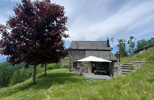 Entirely renovated rustico with an unobstructable view over the Centovalli to Monte Rosa. Large terraced lawn. 3 minutes from the Verdasio-Comino cable car. Restaurant and grotto 3 minutes away. The Comino mountains are 1200 m a.s.l. and can be reached in 6 minutes by cable car or on foot in 1 hour. The mountain is also the crossroads of many footpaths.Completely renovated rustic house (90m2). Ground floor: large eat-in kitchen with fridge and gas boiler, fireplace, satellite TV, radio; shower/WC. 1st floor: 2 bedrooms (2-3 beds each). Outside: large garden with granite table and grill. Solar-powered electricity.