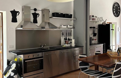 The spacious and well-equipped kitchen (refrigerator, freezer, electric cooker and oven, dishwasher, American and Italian coffee machine, toaster, crockery) is dominated by an imposing wooden table and two sofas, one upholstered in dove grey, the other with a lively white and orange striped upholstery. On the walls are two striking clocks, one of which is an original iron screen, adding a touch of character to the room.