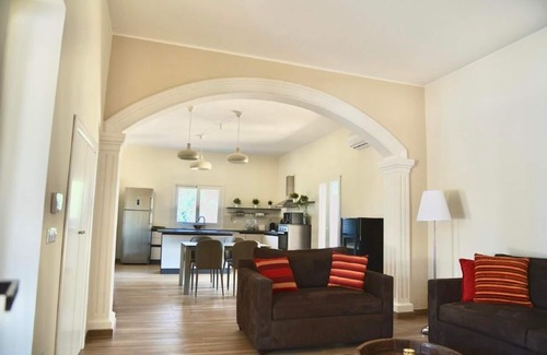 The Villa has a very spacious living and dining room, a well-equipped kitchen, with all the necessary kitchen appliances, three bedrooms (with large double beds) and two large bathrooms (one with a washing machine). All rooms are air-conditioned. A shaded large yard is connected to the dining room overlooking a cozy garden with orange and lemon trees.